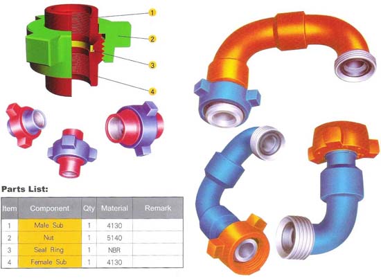 High-pressure union , importing international advanced technology , is forged with high- strength alloy steel , strict heat treatment process can ensure that the nipple have uniform metallurgical structure and pressing and the material meets ASTM and AISI Standard and technology indexes conform to APT Spec 6A , the product adopts some end connections of pipeline thread product thread , butt-weld and compress-seal . The type mainly mainly consists of 100# , 200# , 206# , 207# ,211# , 300# , 402# , 600# , 602# , 1002# , 1003# ,1502# , 2002# and 2202# .