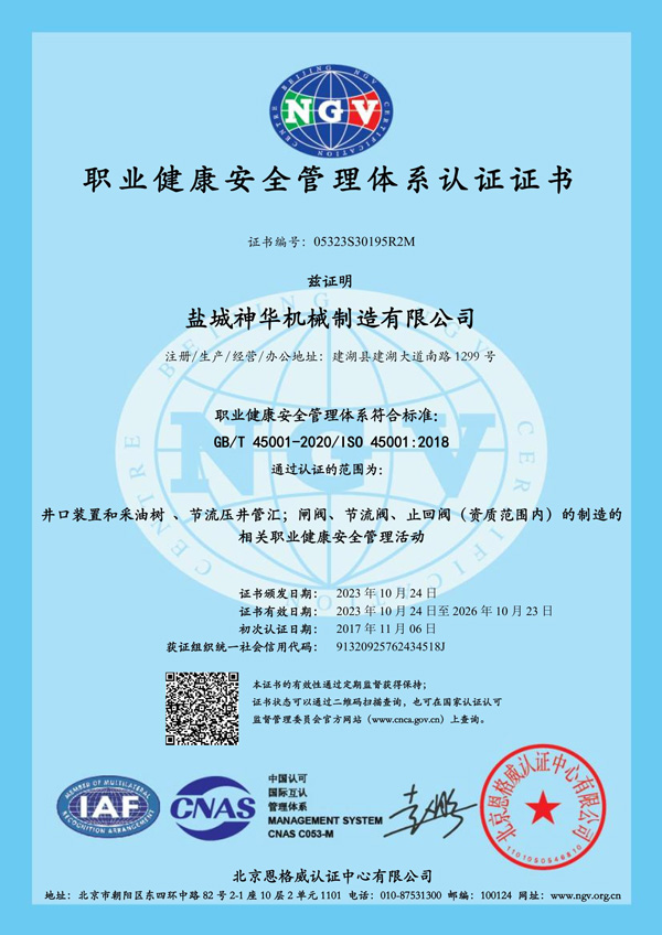 職業健康安全管理體系認證證書